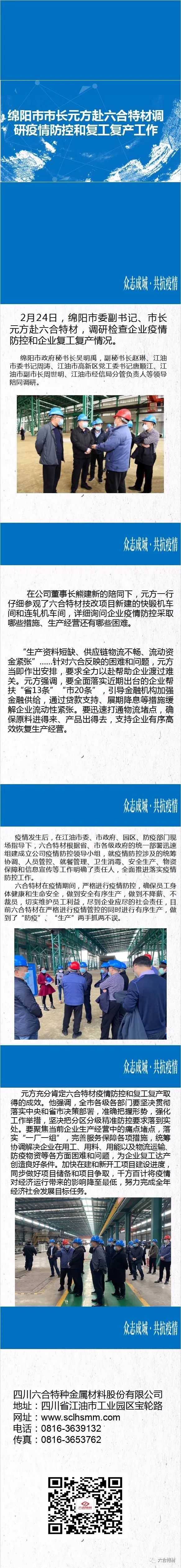 2月24日,绵阳市委副书记、市长元方赴六合特材,调研检查企业疫情防控和企业复工复产情况。