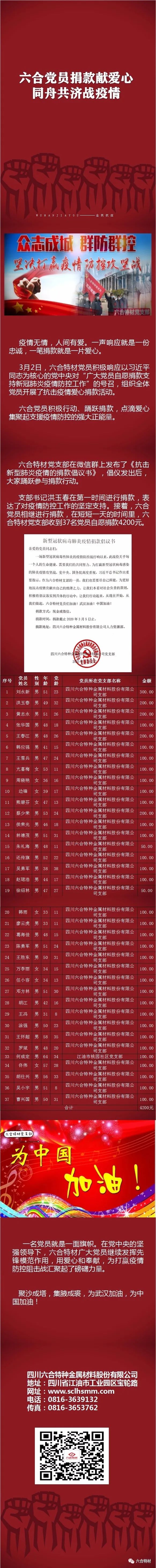 3月2日,六合特材党员积极响应以习近平同志为核心的党中央对“广大党员自愿捐款支持新冠肺炎疫情防控工作”的号召,组织全体党员开展了抗击疫情爱心捐款活动。