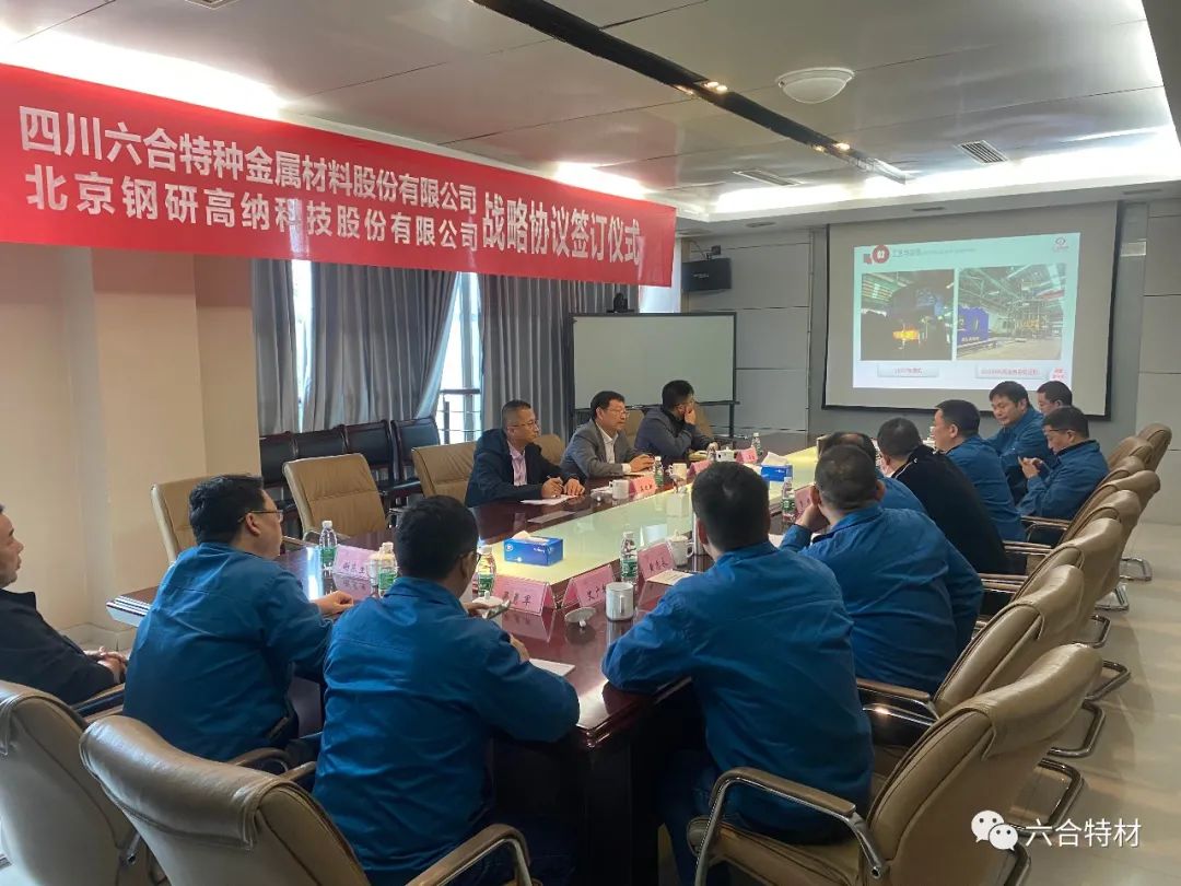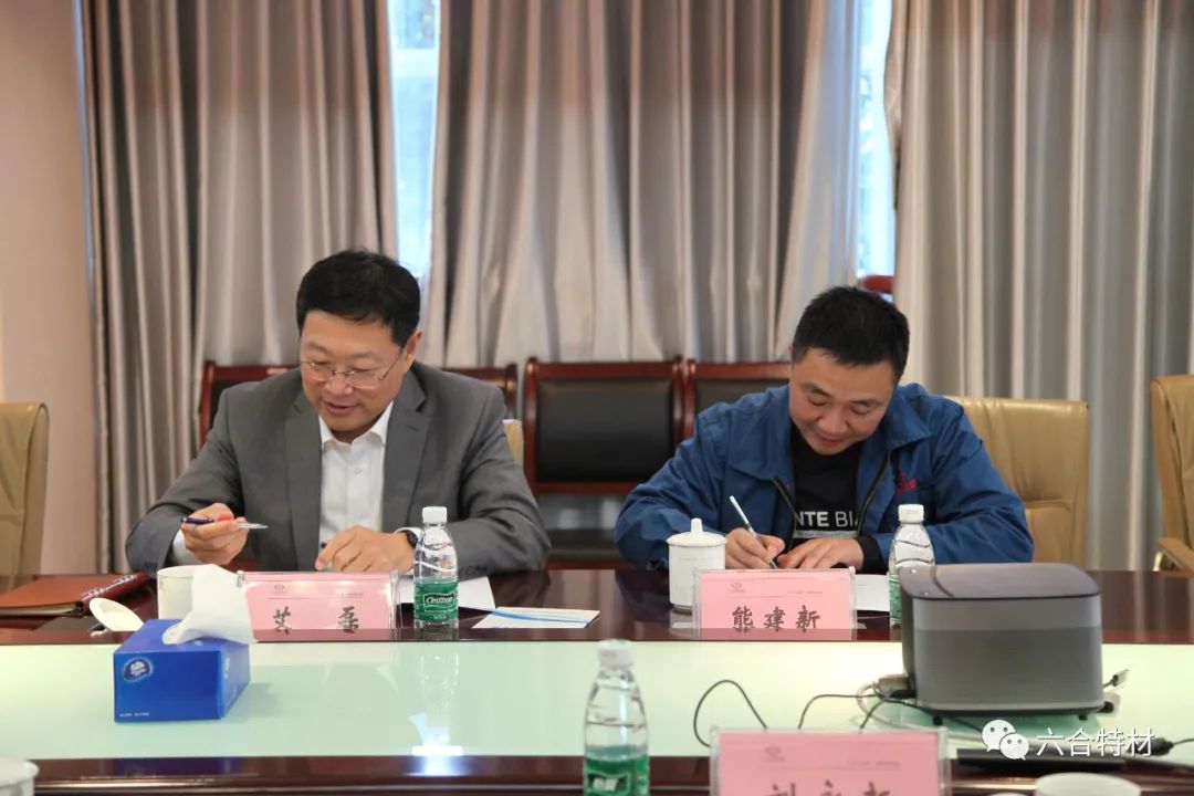 协议签署前,双方进行了会议座谈。中国钢研集团董事会秘书、钢研高纳董事长、党委书记艾磊,钢研高纳科技发展部、重点试验室主任毕中南,钢研高纳市场服务部高级专员蒋建新,六合特材董事长熊建新,副董事长罗明,董事长助理刘永新等领导参与座谈。