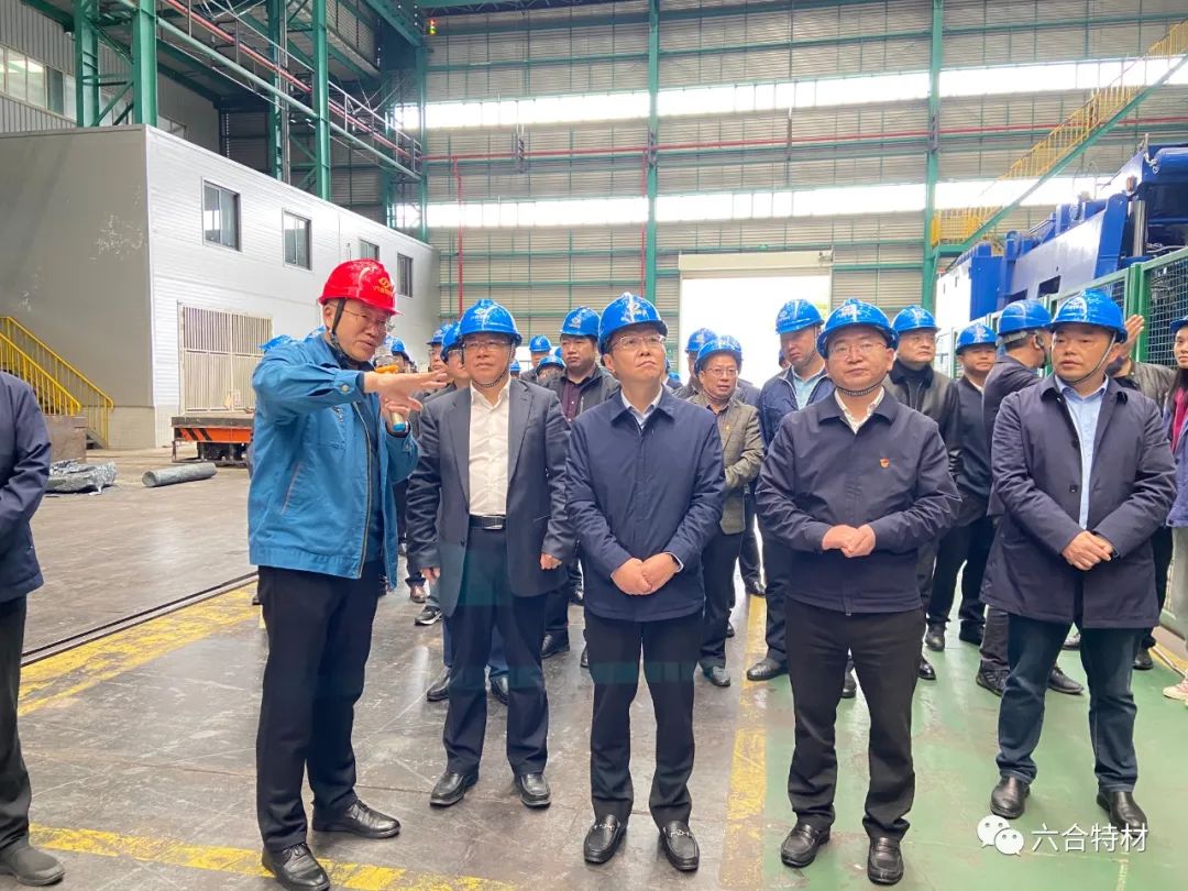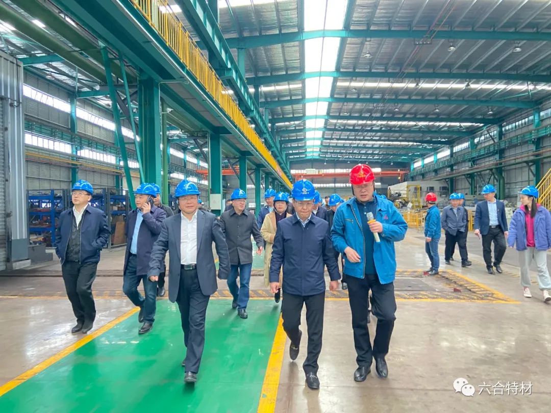 六合特材行政总监陈镜代表六合特材对兰劲一行的到来表示热烈欢迎,并向调研领导介绍了公司生产经营情况及公司技改项目建设情况。随后,兰劲一行深入六合特材生产厂区进行调研,参观了快锻机车间及连轧车间,兰劲对六合特材近年来围绕国家重大装备配套进行升级转型,完成8.7亿元航空、燃机项目建设表示称赞,同时,对六合特材立足特种金属材料研发生产为国家重大装备制造提供强有力支撑表示赞赏和肯定。