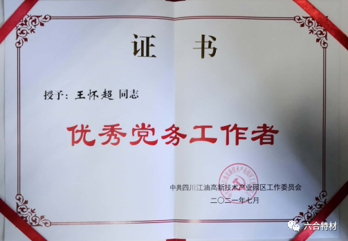 六合特材机电班班长王雪兵、综合部部长侯荣光荣获高新区优秀党员称号;物理检测室主任边锋,党支部副书记王怀超荣获高新区优秀党务工作者称号。