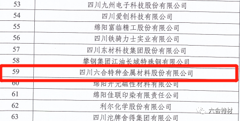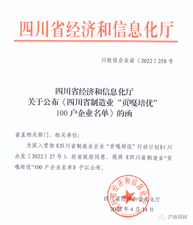 日前,四川省经济和信息化厅公布了《关于四川省制造业“贡嘎培优”100户企业名单》,四川六合特种金属材料股份有限公司(以下简称:六合特材)榜上有名。