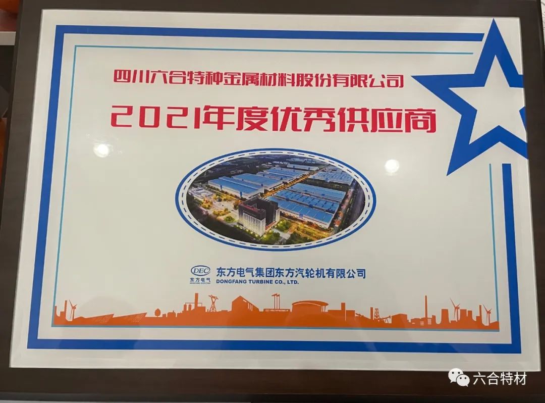 四川六合特种金属材料股份有限公司凭借优质的产品、专业的服务、精细的管理、高效的指标成为东方电气集团“2021年度优秀供应商”。这既是对公司真诚服务客户的肯定,更是对公司多年来严细管理的褒奖。