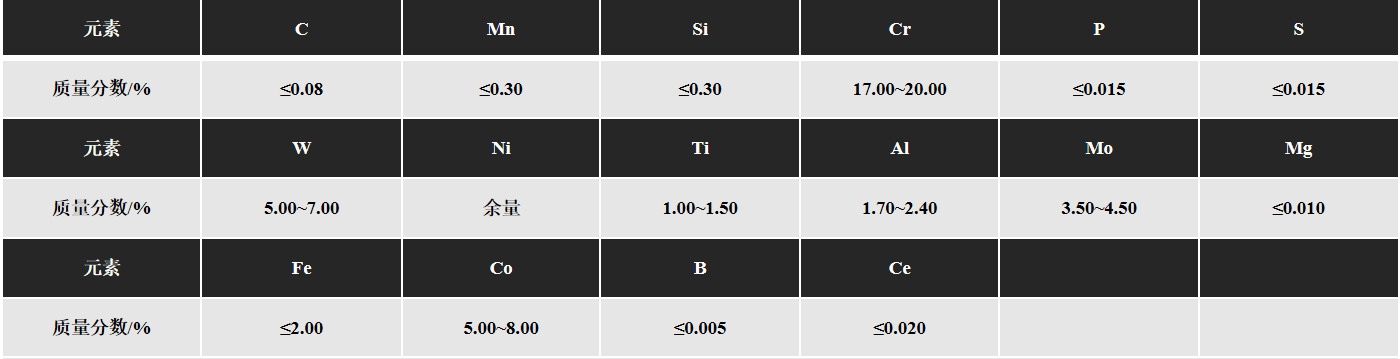 GH4099 is a Ni-Cr based precipitation hardened wrought superalloy, with the long-term service temperature below 900℃, and short-term operating temperature up to 1000℃. The alloy is strengthened by adding W, Mo, Cr, and Co for solid-solution strengthening, adding Al and Ti to form γ' precipitation strengthening phase, and adding trace B, Ce and Mg for grain boundary strengthening, offering the obvious comprehensive strengthening. The alloy has excellent room and high temperature strength, outstanding oxidation resistance, and good thermal processing and welding performance.