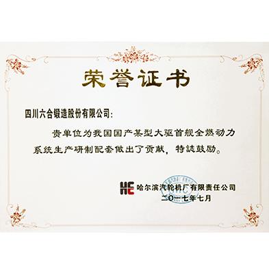 Honorary Certificate for Liuhe products being applied to the first vessel of a domestically developed large destroyer class