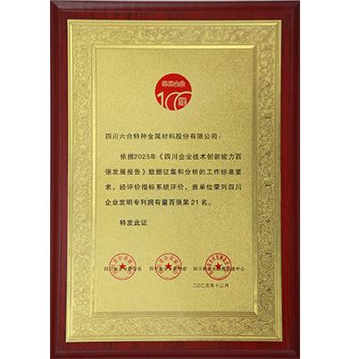 Ranked 21st - 2025 Top 100 Sichuan Enterprises by Number of Invention Patents