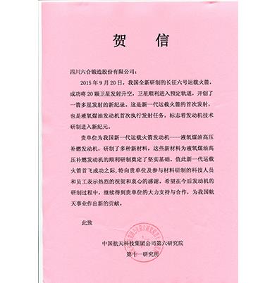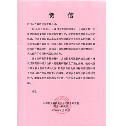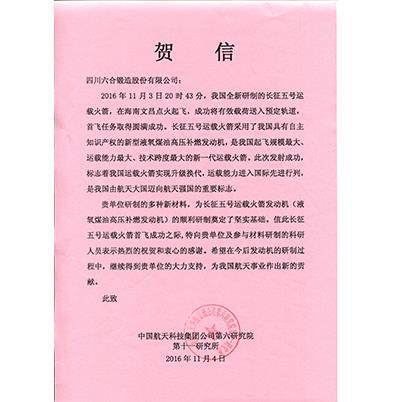 Congratulatory letter from the China Aerospace Science and Technology Corporation for Liuhe products being applied to the Long March 5 launch vehicle