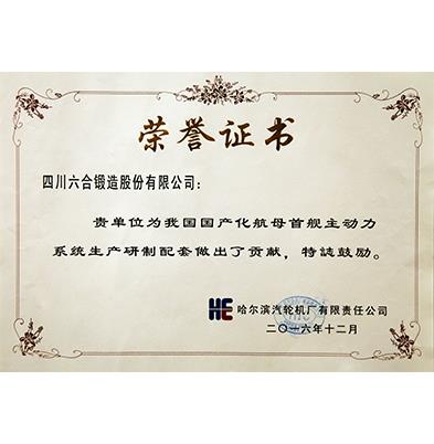 Honorary Certificate for Liuhe products being applied to the first domestically built aircraft carrier