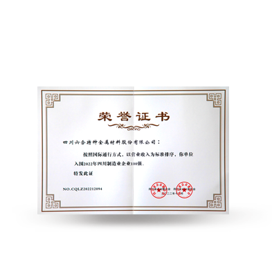 Honorary Certificate for 2022 Top 100 Sichuan Manufacturing Enterprises