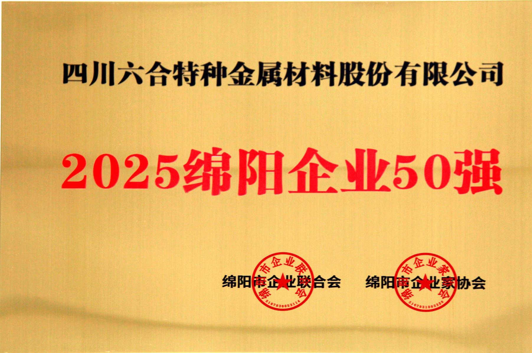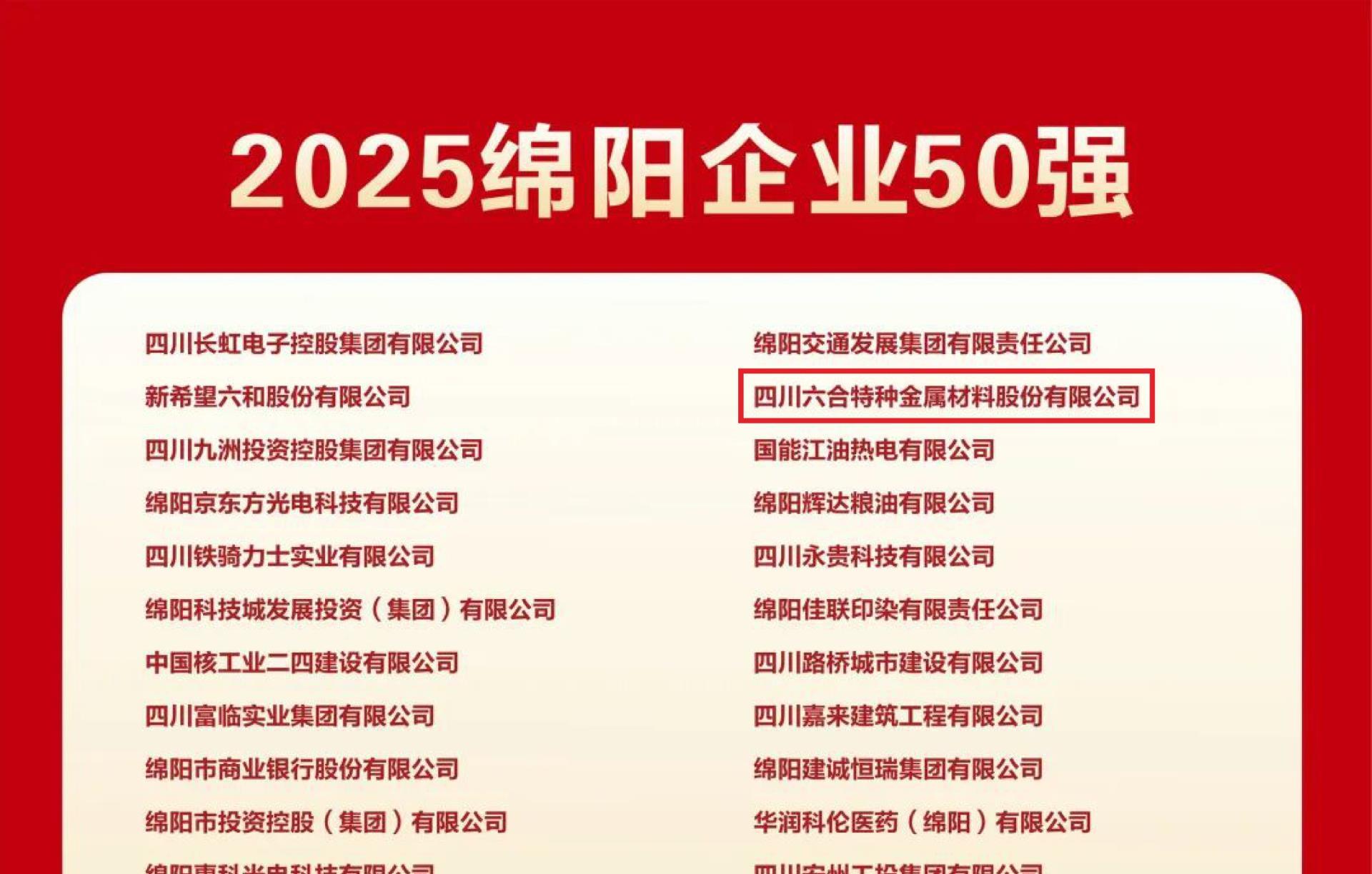 10 月 24 日,2025 绵阳企业 50 强发布会在四川绵阳工业园举行,四川六合特种金属材料股份有限公司(简称 “六合特材”)凭借特种金属材料领域的技术突破、稳健经营与产业贡献,成功入选,成为先进材料产业标杆。