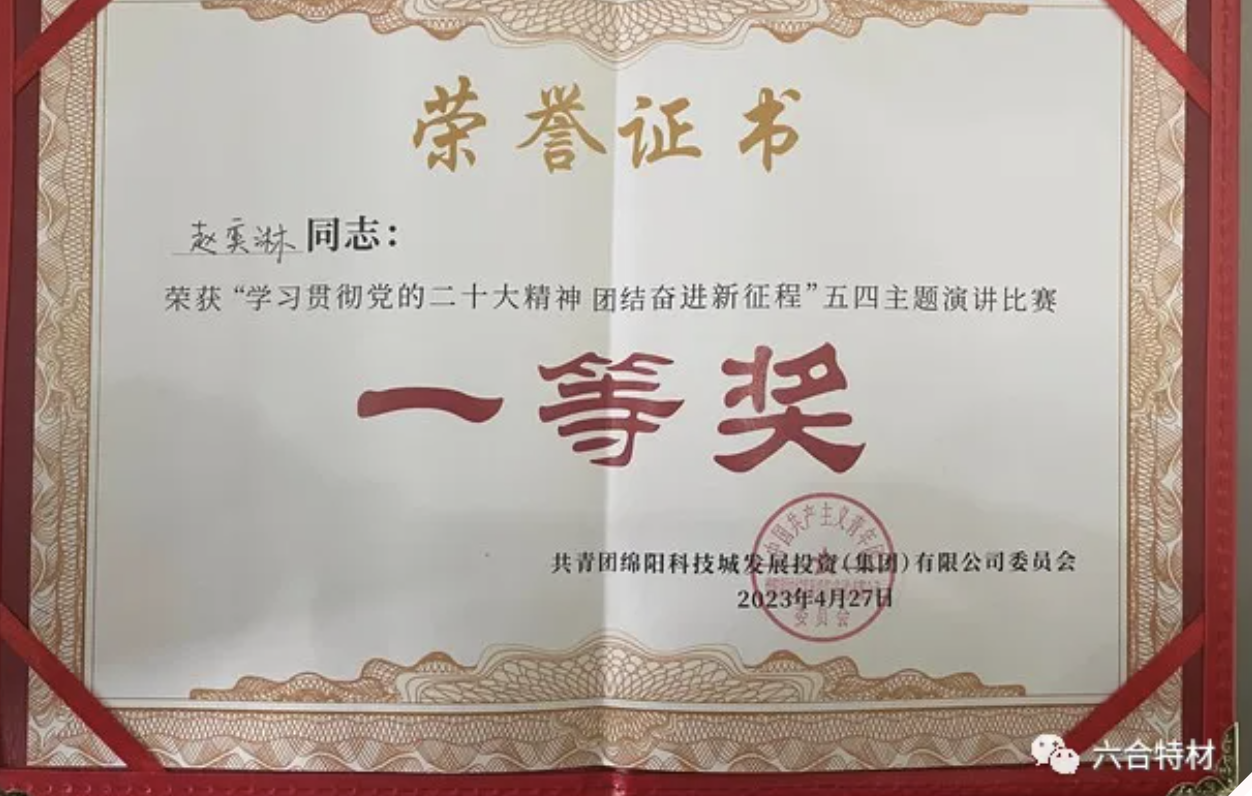 为推进职工业余文化,激发职工爱国之心,值此五四来临之际,4月27日以“学习贯彻党的二十大精神 团结奋进新征程”为主题的演讲比赛在科发集团拉开帷幕。六合特材员工赵奕淋积极参与共青团活动,代表公司参与演讲比赛荣获一等奖。